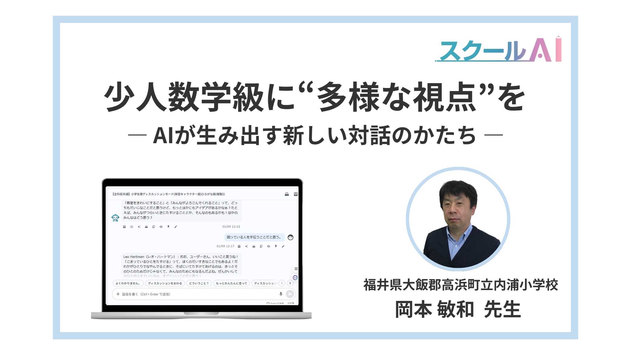 スクールAIに教育の新たな可能性を強く感じています。算数科を中心に、チャット型生成AIを活用したプロンプト設定や情報の差し込み機能により、主体的・対話的で深い学びを実現する授業づくりをサポートします。また、学習記録の可視化やフィードバック機能を通じて、学習者が自律した学習者へと成長できる環境を提供し、教員と児童生徒の双方が効果的に学び合える未来を築きます。