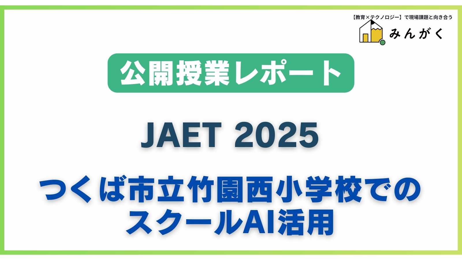 JAET 2025では、公開授業校6校(幼稚園〜高校)のうち、つくば市立の小・中学校4校でスクールAIが積極的に活用され、14日午後のパネルディスカッションでも2校が登壇。現場でのAI活用が着実に広がっていることを実感しました。