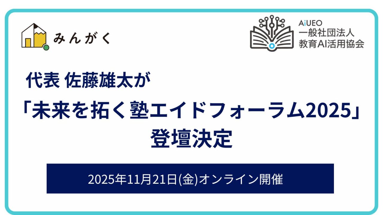 2025年11月21日(金)に開催される【未来を拓く塾エイドフォーラム2025】に、株式会社みんがく代表の佐藤雄太が登壇いたします。 本フォーラムは、「次の時代…