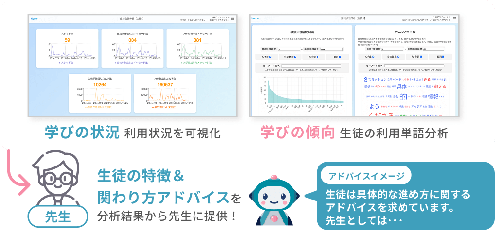 スクールAIでは、生徒それぞれに最適なサポートが可能です。生徒の学習状況や理解度に合わせて、出題内容や説明の仕方をAIが自動で調整します。また生徒の会話や解答を分析し、指導方法などのアドバイスを先生に提供します。