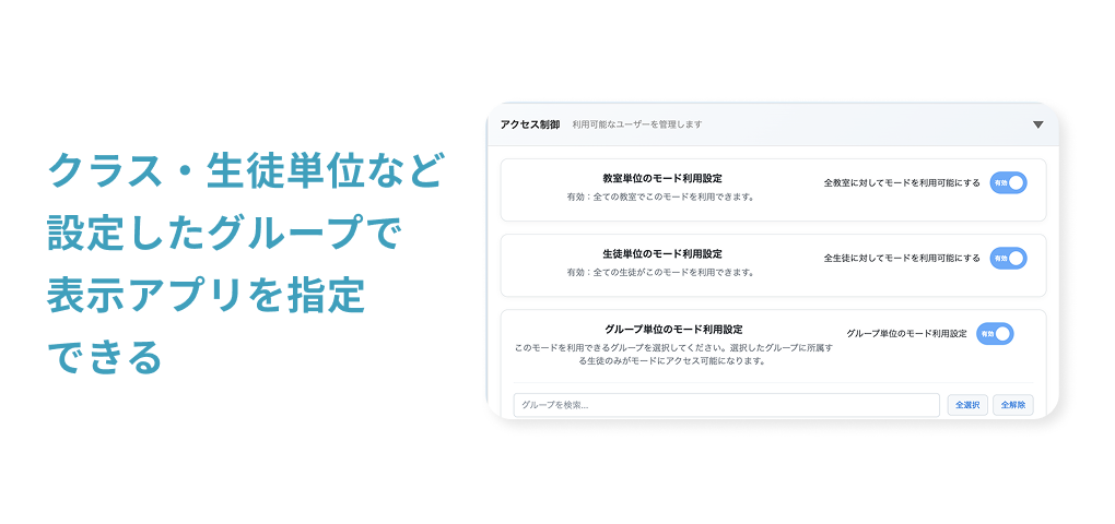 先生が生徒の利用状況やログを確認できるため、適切な利用がなされているかを把握でき、教育現場でも安心して利用できます。