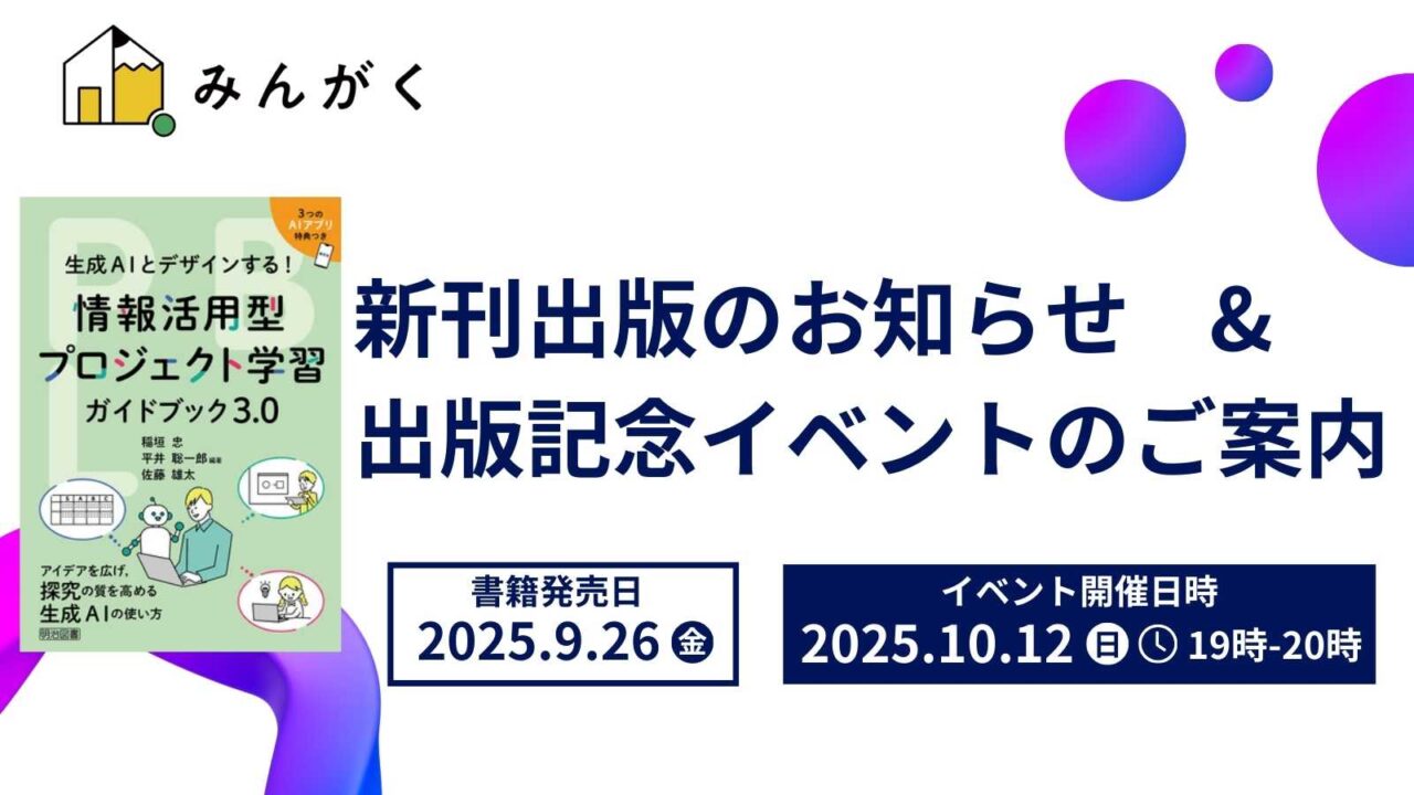 このたび、株式会社みんがく代表・佐藤雄太が共著した書籍が、明治図書出版より刊行されることになりました。教育現場での生成AI活用をテーマに、探究学習(PBL)の授…