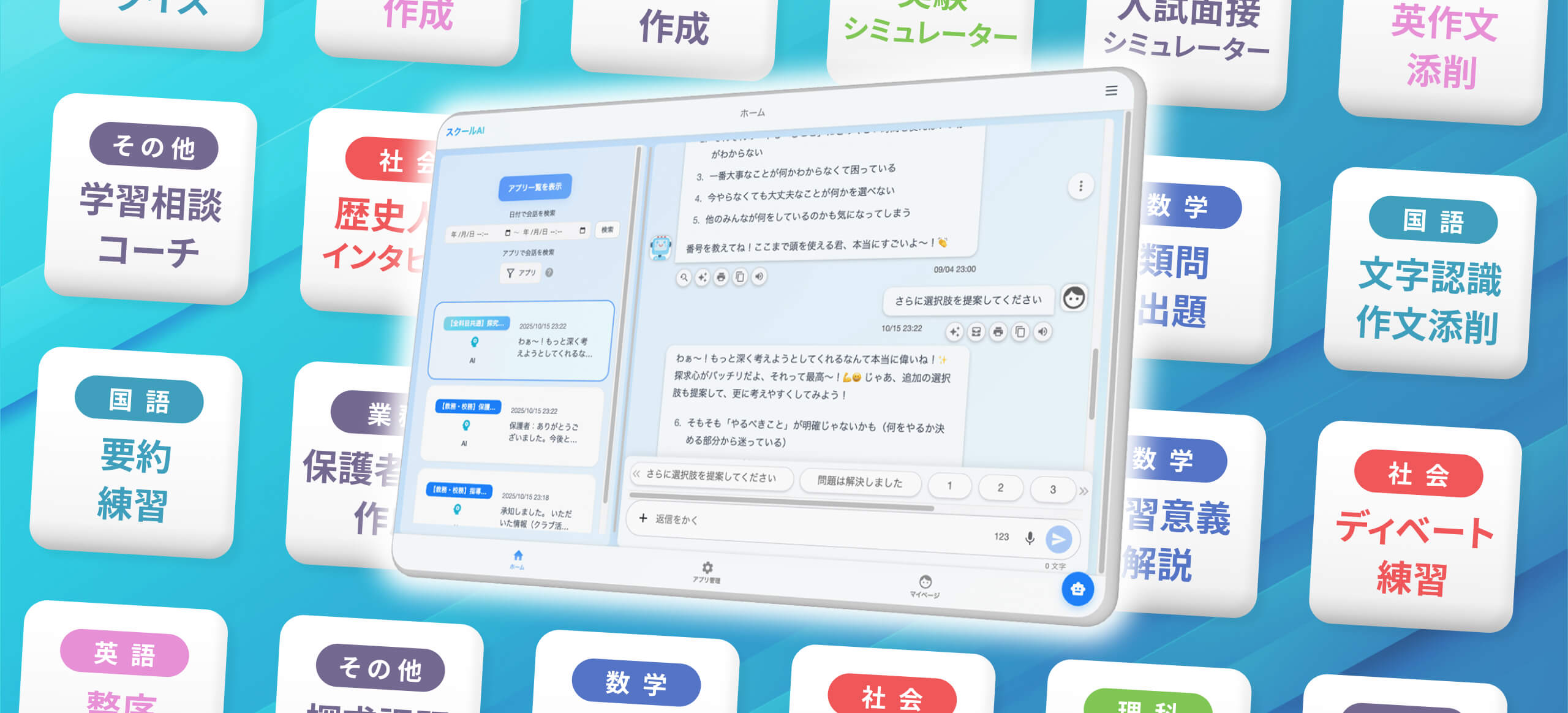スクールAIはWebブラウザベースのサービスですので、ブラウザをインストールしている端末であれば基本的にご利用いただけます。 万が一不具合が発生した場合はサポートいたしますので、お問い合わせください。